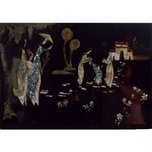 Vintage Mother of Pearl Black Lacquer Painting Wall Hanging.../ Vintage Mother of Pearl Black Lacquer Painting Wall Hanging / Wall Tapestry
